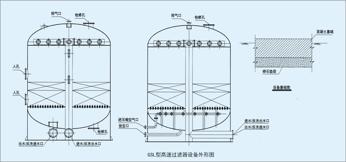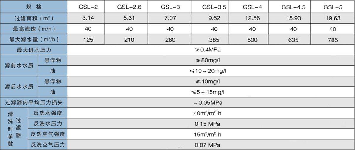 GSL型高速過濾器在原水懸浮物較多的情況下能確保出水水質的高質量,具有過濾速度高、處理水量大,占地面積小等優點。